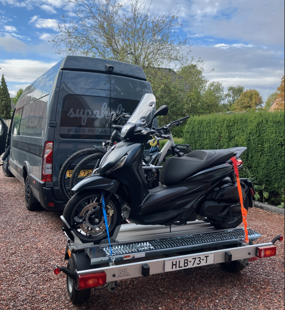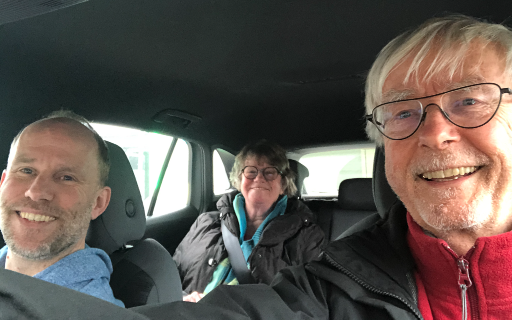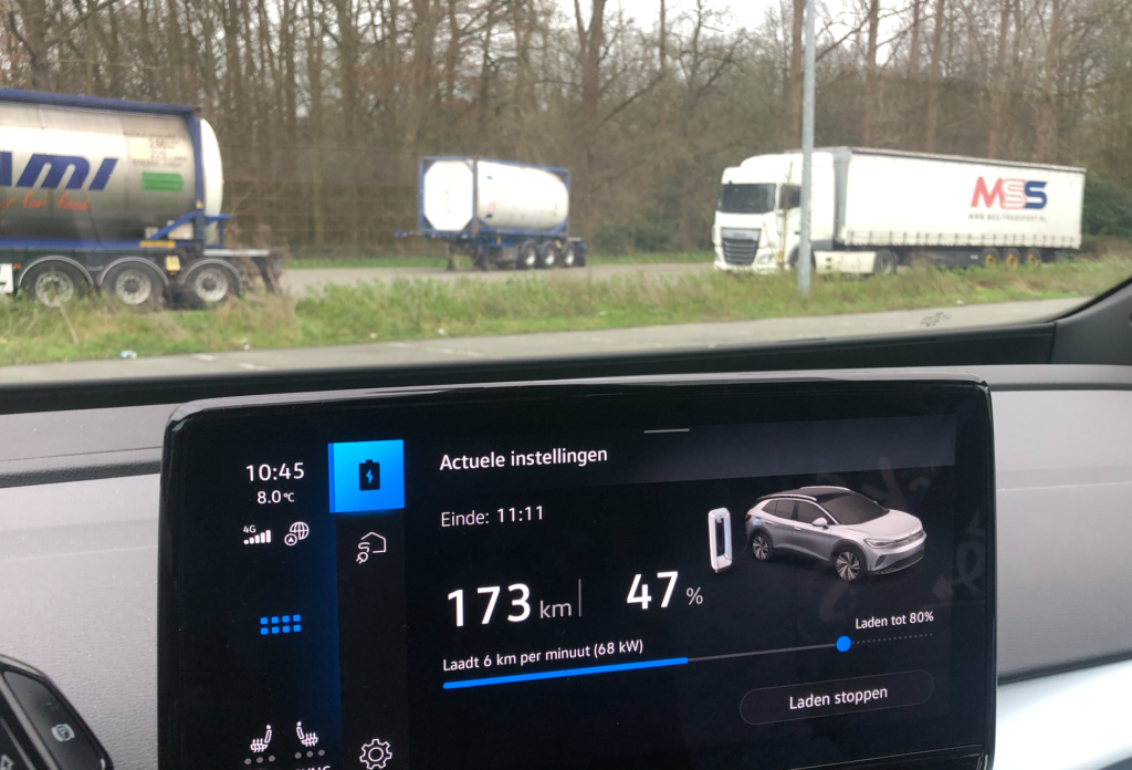Gaandeweg heeft iedereen zich om half 10 bij het koffieapparaat in de keuken verzameld. Wij pakken in en vertrekken om 10 uur. We moeten al gauw een snellaadstop maken in Kemzeke langs de E34.