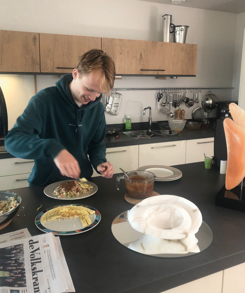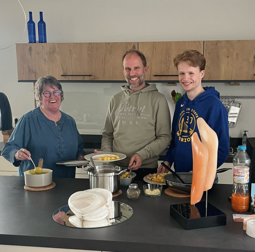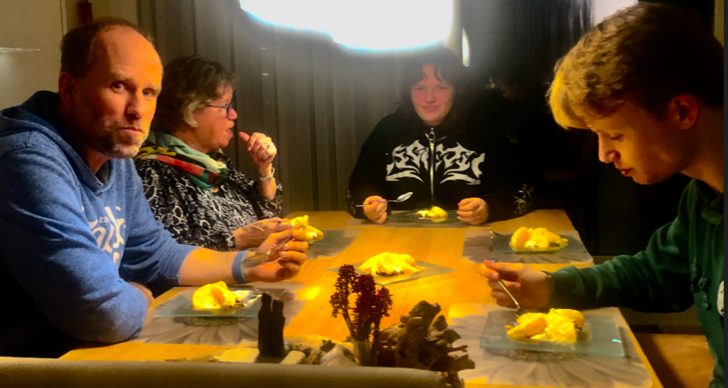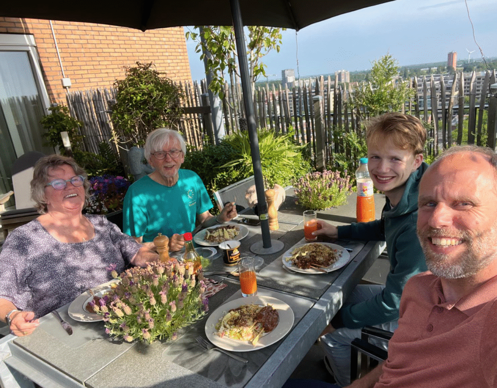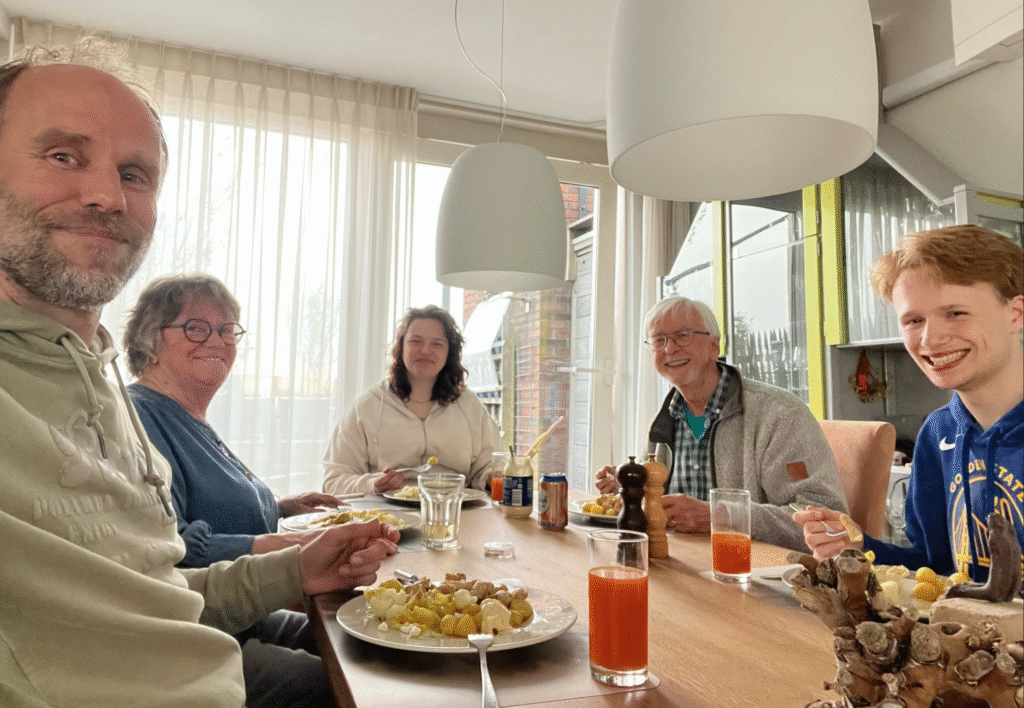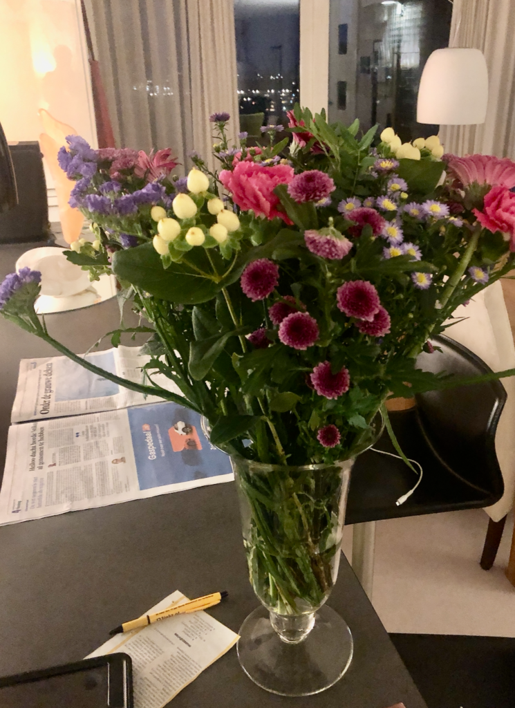 Vandaag hebben we de Peppelschransers weer te eten. Deze keer schuift ook Damien, de vriend van Rune aan. Hij had voor ons een mooie bos bloemen bij zich.