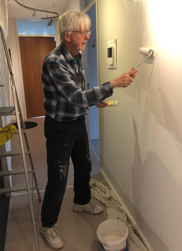Na het klussen met Arno gaat Ap verder zonder Arno. De gang behoeft na 12 jaar een likje/rollertje verf. In de kelder vond Ap nog een restantje van zo lang geleden. Niet precies dezelfde kleur wit maar dat valt op wat kleine muurtjes niet op.