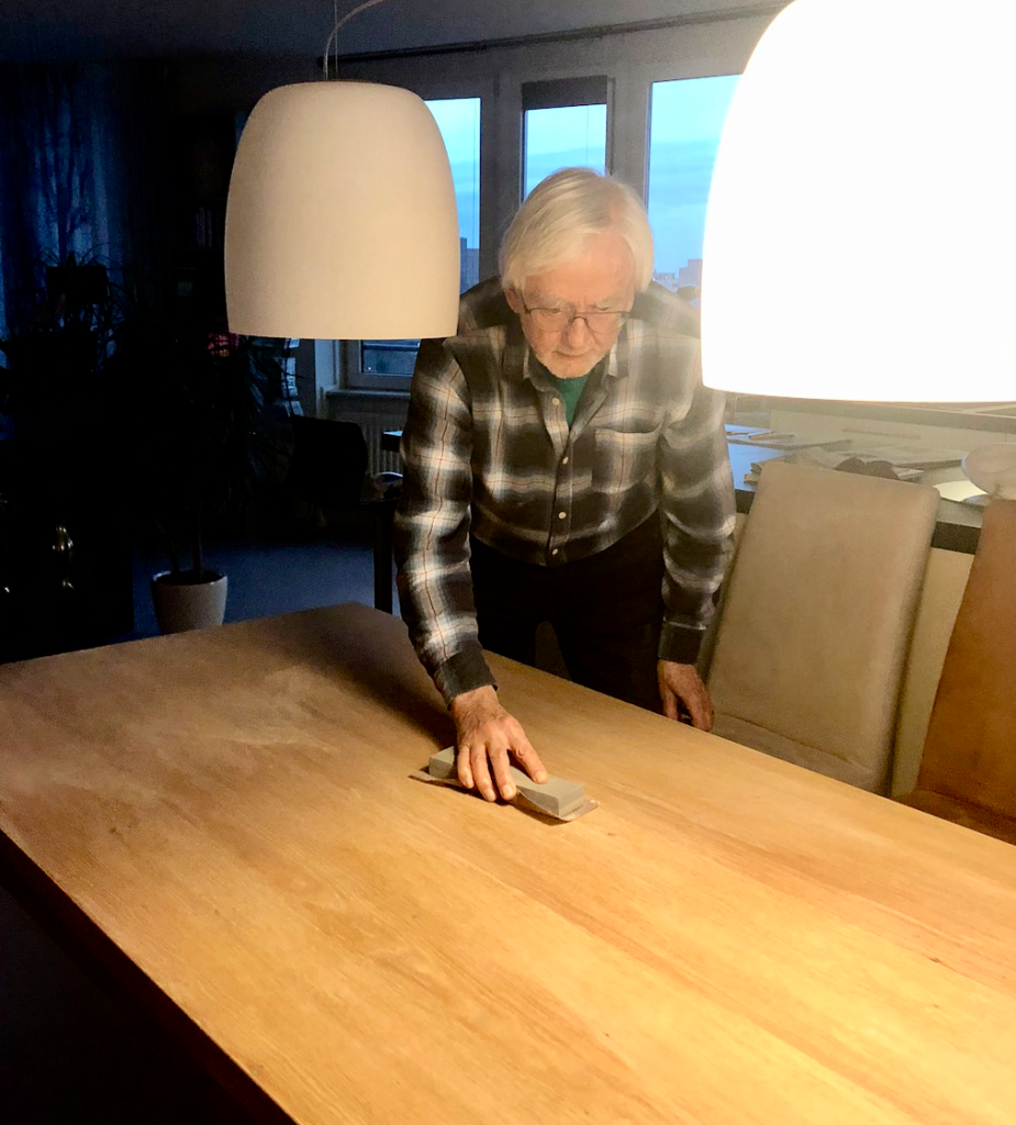 Ap begint ook aan de eiken tafel. Het blad is niet meer om aan te zien.