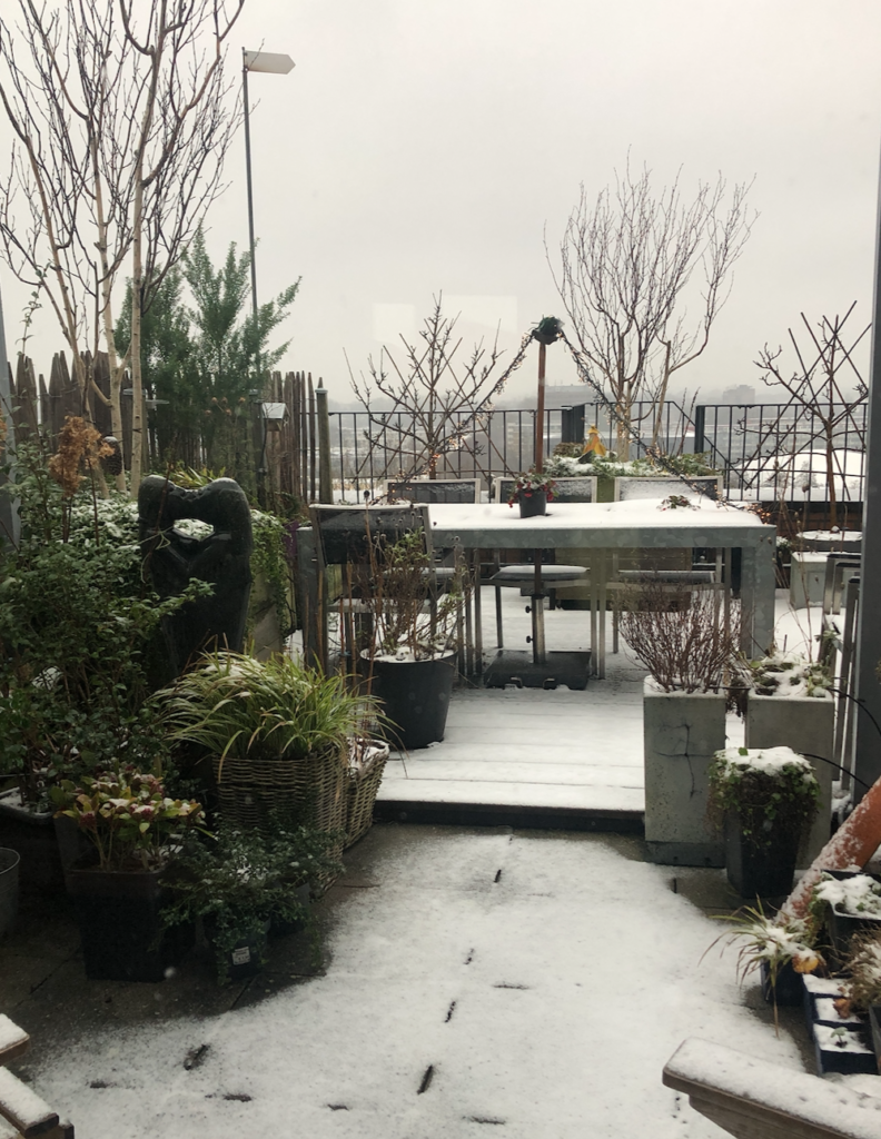 We werden wakker met een witte wereld om ons heen. Een klein laagje sneeuw. Nu komen de kerststukken echt tot hun recht. Zeker met alle lampjes brandend.