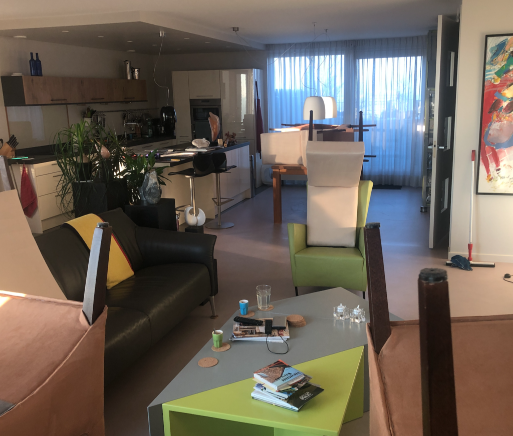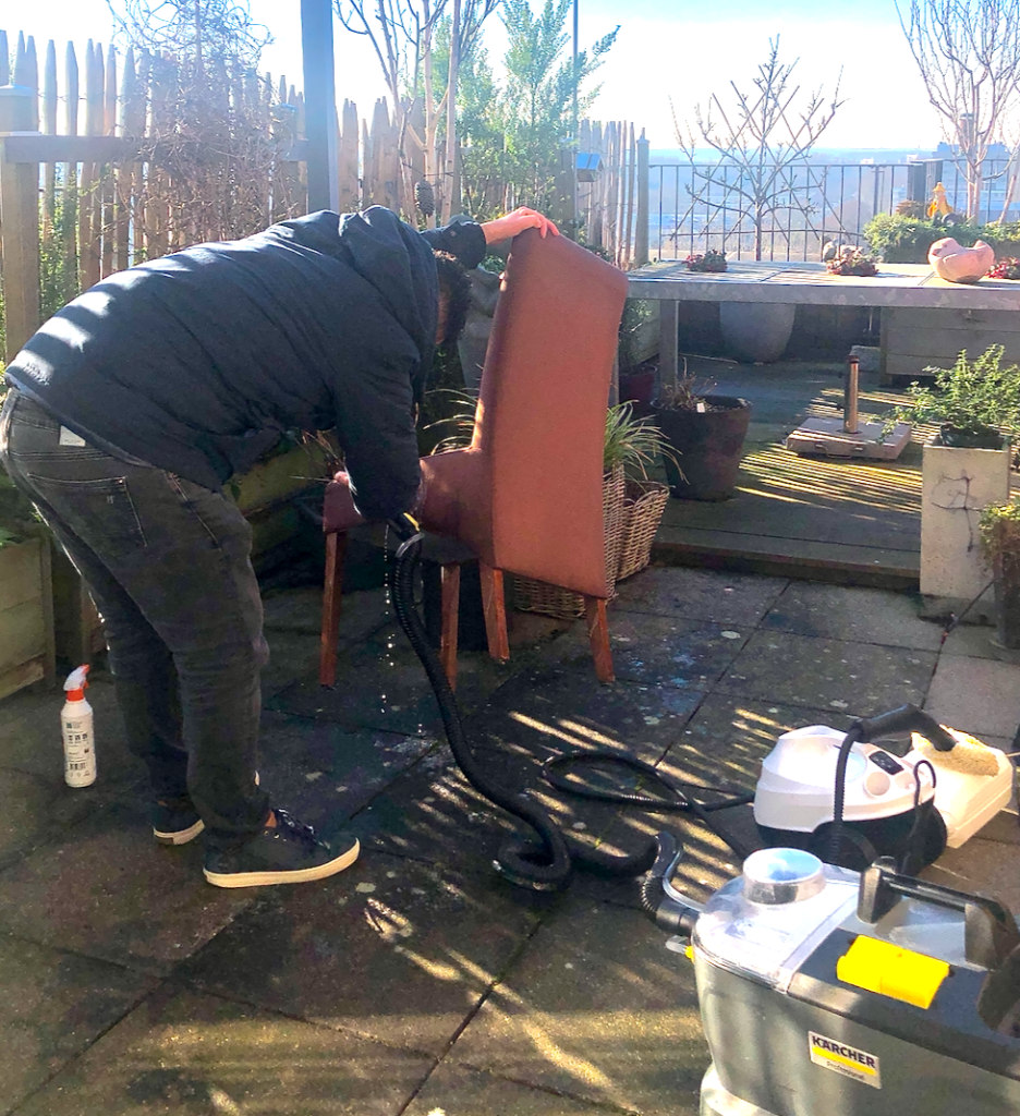Stipt op de afgesproken tijd komt om 2 uur een bedrijf langs om onze eetkamerstoelen schoon te maken. Voor het eerst sinds we ze in 2005 bij Leen Bakker kochten, toen we naar de Potgieterlaan verhuisden. De jongeman deed zijn klus op het dakterras lekker in de zon, maar wel koud. Na 2 uur was hij klaar met de 8 stoelen. Kosten: € 110.