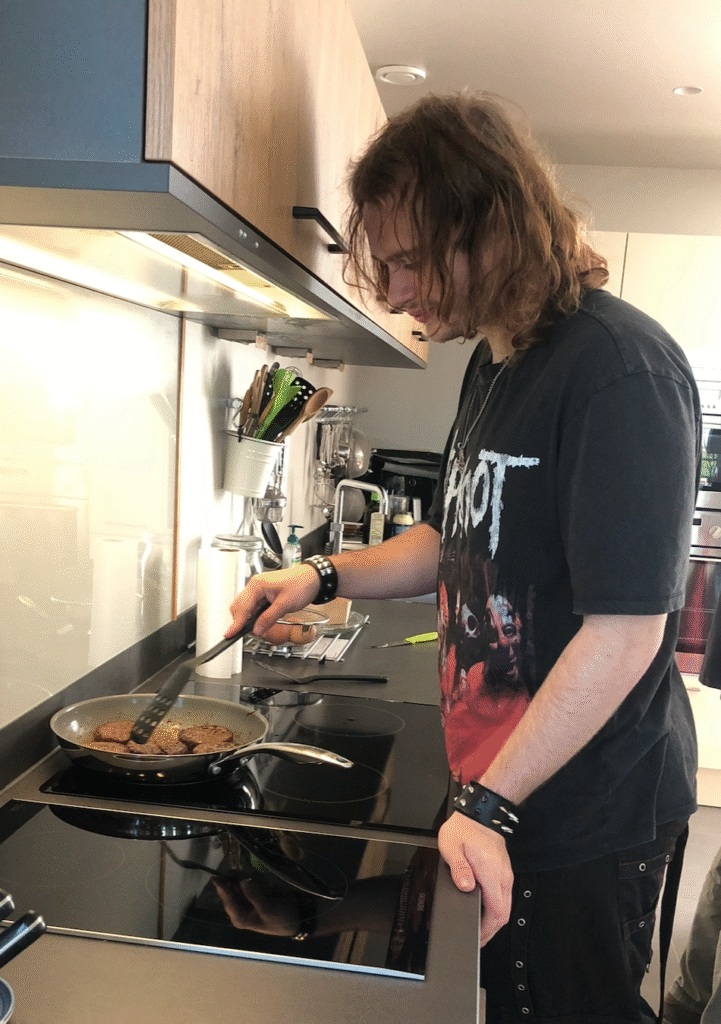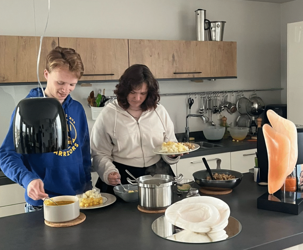 Vanavond eten de Peppelaars weer mee. Vanavond staan zoete aardappel uit de oven, gewokte spruiten met appel, gember en hete saus en gebakken kipstukjes op het menu. Alles ging schoon op. Nou ja schoon, we hadden giga flinke afwas. Volgende keer komt Damian mee.