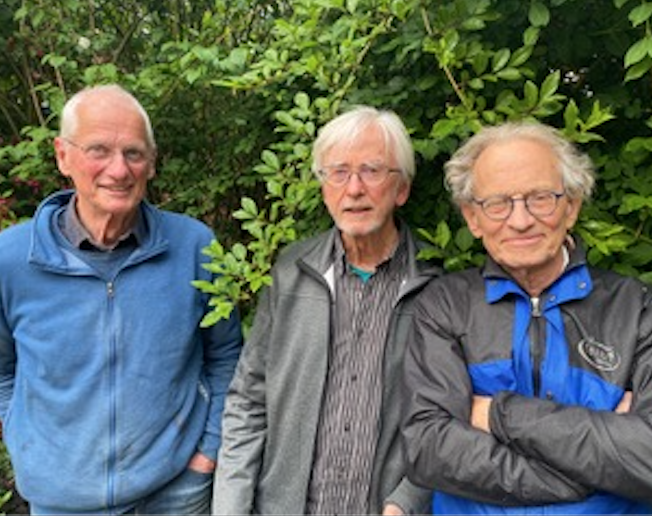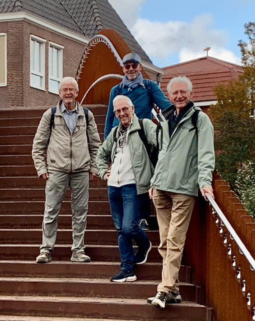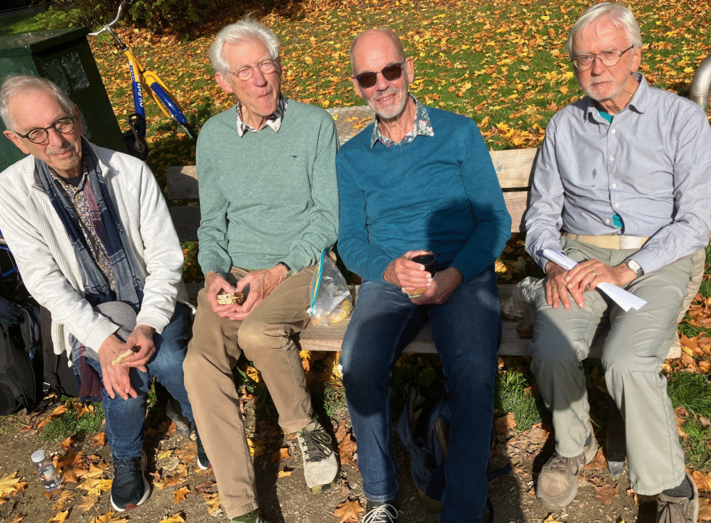Ap heeft vandaag zijn fiets/wandeling met Nico Verbeek en 2 klasgenoten van het seminarie in Noordwijkerhout. Hij heeft een zoektocht door Leiden geconstrueerd, die afwisselend met de fiets en te voet (met de fiets aan de hand) wordt gemaakt. Een nieuw concept voor mensen die minder goed te voet zijn en graag even uitrusten op een OV-zadel. Die fietsen hebben alleen een terugtraprem en dat was voor de heren wel even wennen.