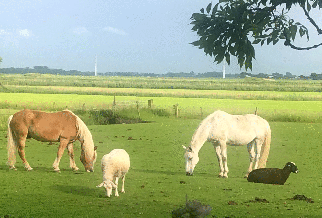 We fietsen verder naar de bijzondere Millinger Theetuin. Maar zover komen we niet. De weg is hermetisch afgesloten door graafwerkzaamheden en er lopen zwarte grazers rond. Ook met de fiets kunnen we er niet langs.