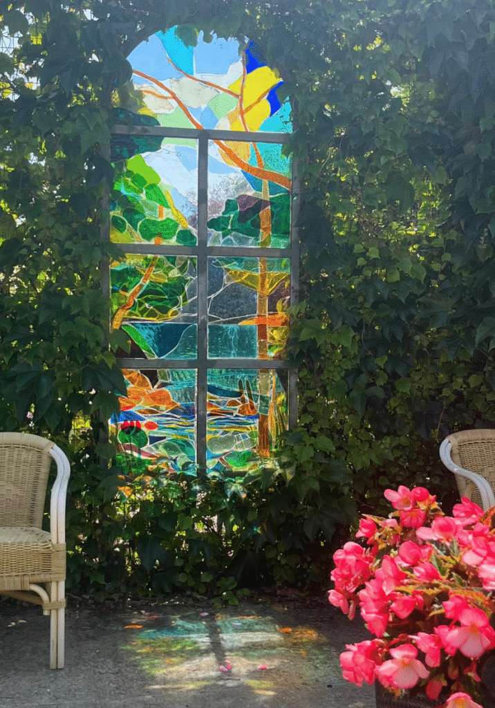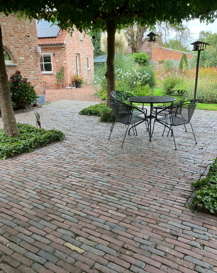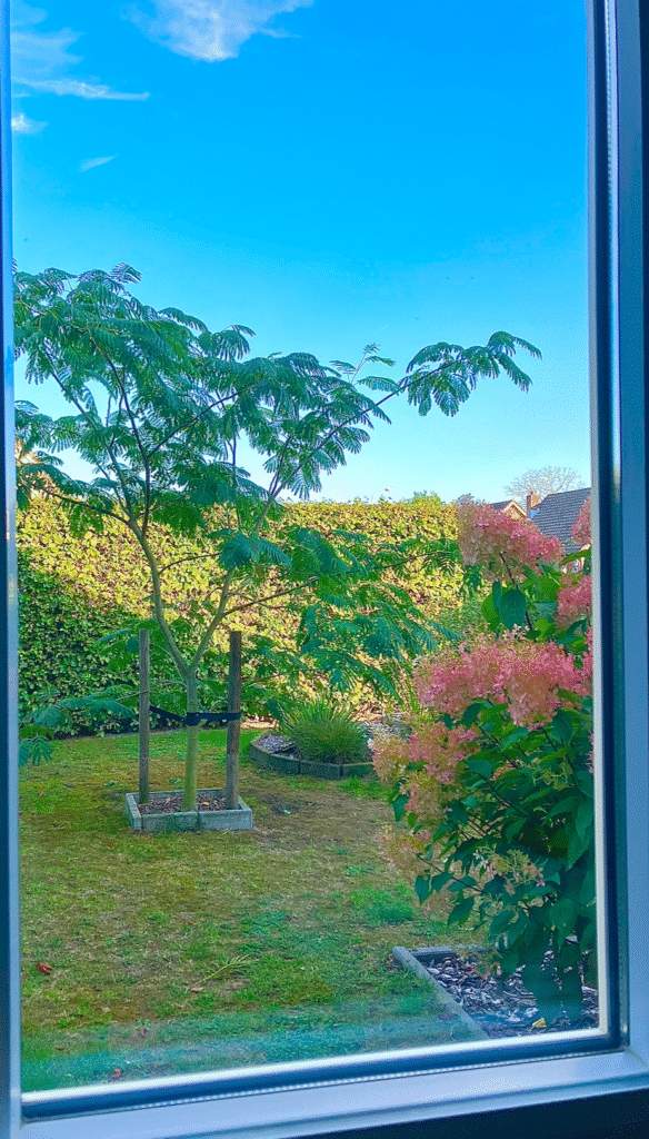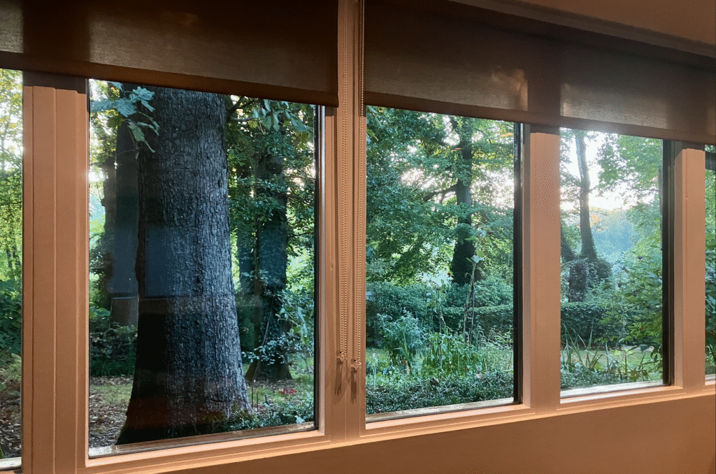 Thuis gekomen nemen we in de zon een lekker glas wijn. Het huis is omgeven door bomen van wel 20 meter. Nog vol in het blad zijn de zonnige plekjes schaars.