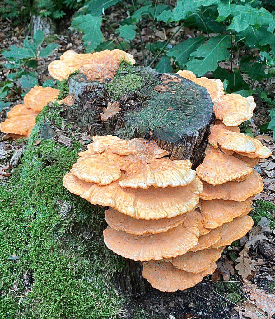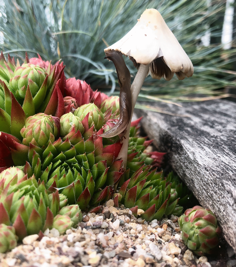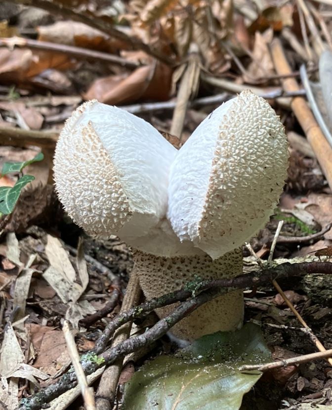 Weer bij ons huisje zagen we deze bijzondere paddestoel staan. Het is een Parelstuifzwam.