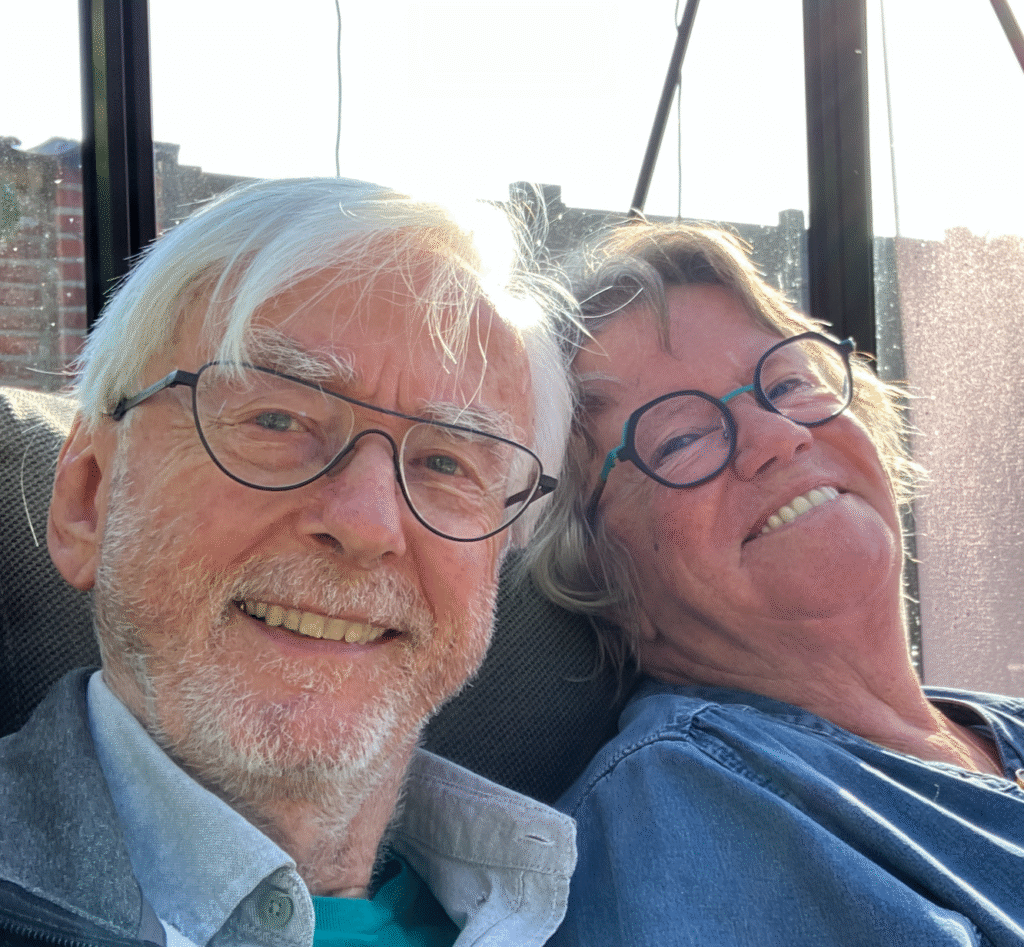Na alle gedraaide wassen, het opruimen e.d. gaan we – tussen de buien door – even bij Giel aan. Bijkletsen. En toch kwamen wij kletsnat aan. Lekkere koffie met amandelkoekjes, vele verhalen over onze en de vakantie van Giel en Linda en ook mooie foto’s.