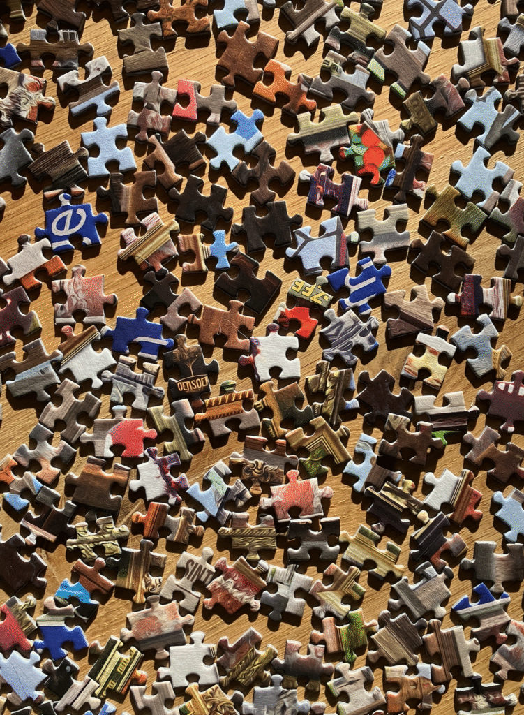 Omdat we geen tv hebben, besluiten we een legpuzzel van Nijmegen te maken. 1000 stukjes! Ap heeft alle kant- en hoekstukjes al bijeen gezocht. Vol goede moed gaat hij verder.