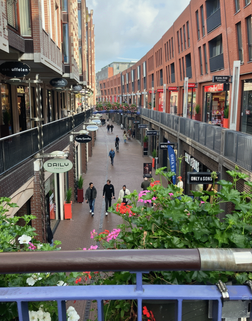 Het is een variant op de koopgoot van R’dam maar veel gezelliger. Met twee lagen winkels mer woningen erboven.