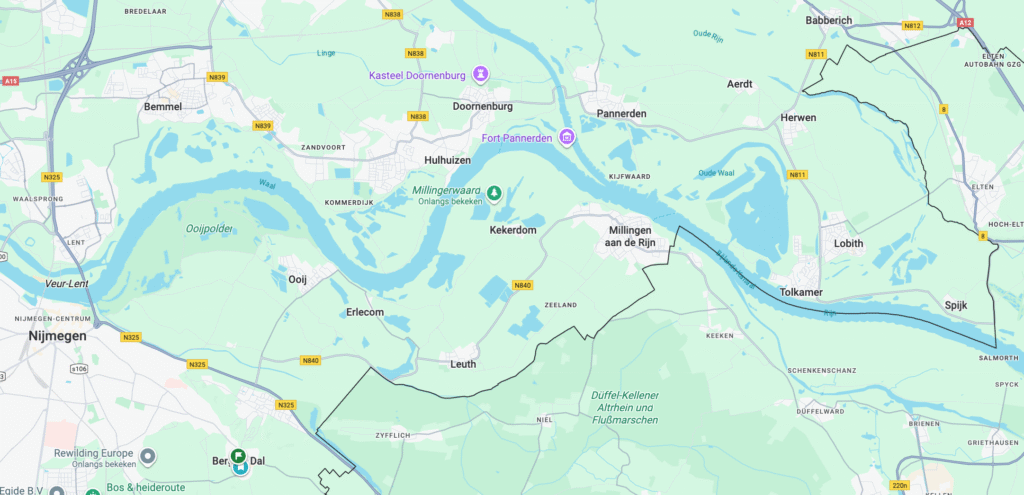 Onze laatste dag in Berg en Dal, morgenochtend om 10 uur vertrekken wij weer. Dus onze laatste fietstocht. We rijden deze keer naar Millingen aan de Rijn. Jawel, aan de Rijn. Nog net, want even buiten het dorp splitst de Rijn zich in de smalle Nederrijn (hoe komen ze eigenlijk aan die naam?) en de veel bredere Waal. Grote stukken van de Millingerwaard zij gebruikt om ruimte te geven aan de rivier.