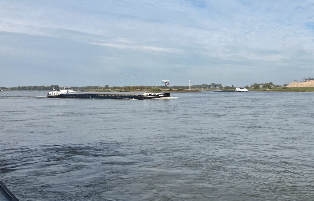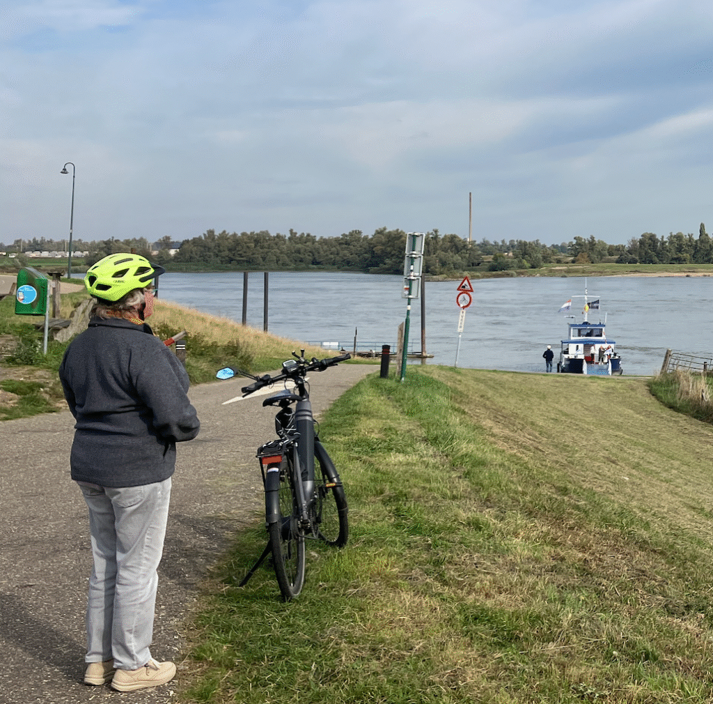 In Millingen hadden we dit pontje kunnen nemen maar dat zou een te grote omweg betekenen. Ap vroeg mensen op een zgn bunkerboot of hij even vanaf het dek een foto van de splitsing mocht maken. “Tuurlijk, meneer! Die witte paal staat op de splitsing: rechts vaar je richting Leiden en links richting Nijmegen.” De man was niet bezig met kolen of olie maar met van die grote flessen water, voor de varende hotelboten. Op de splitsing staat ook het Fort Pannerden.
