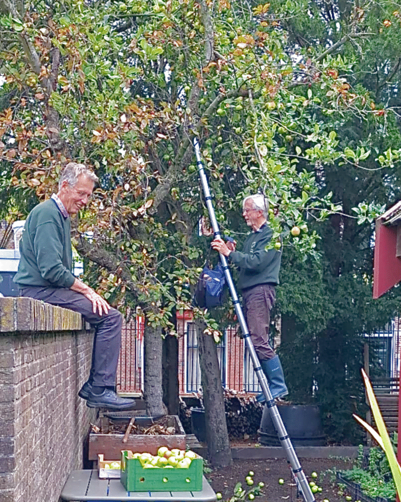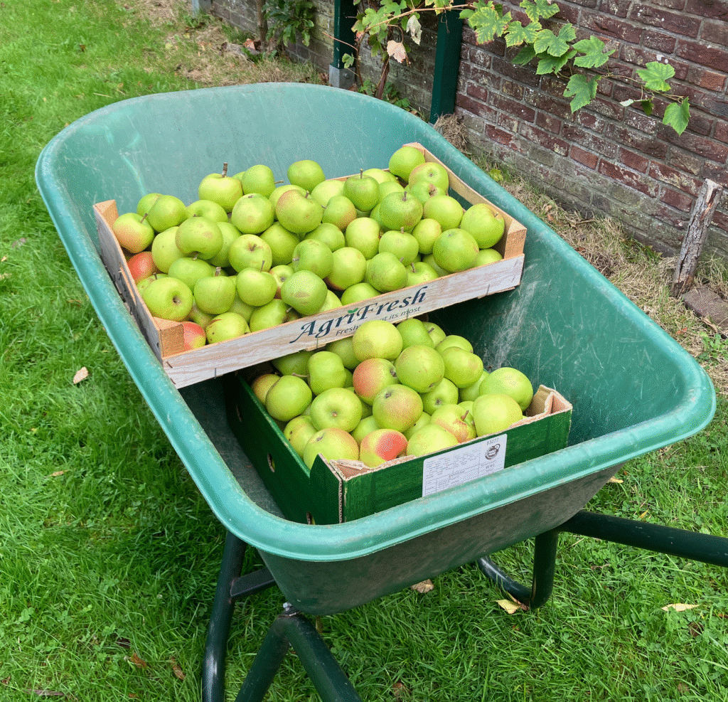 Dinsdag voor Berna fietsdag en voor Ap Volkenkunde dag. Samen met Theo gaat Ap appelen plukken van de boom bij de Kweektuin. Met de ladder van M&M.