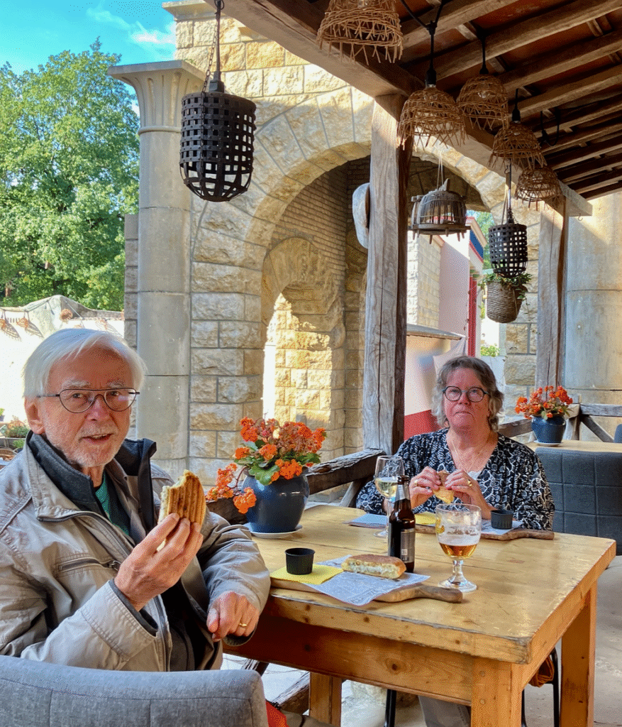 Na installatie wandelend naar Beek (slechts 1,5 km maar heuvels) naar de Plus om wat boodschappen te doen. Een goede oefening voor Berna: doen mijn voeten het (woensdag a.s. belt nl. de orthopeed: hoe is het na de injectie?). Nou nee, voeten niet oké. Maar de winkel gevonden, boodschappen gedaan en Ap had een terras beloofd. In Berg en Dal en Beek is dit weekend het Oktober Fest. Wein, Weib und Gesang, leren Hose etc.