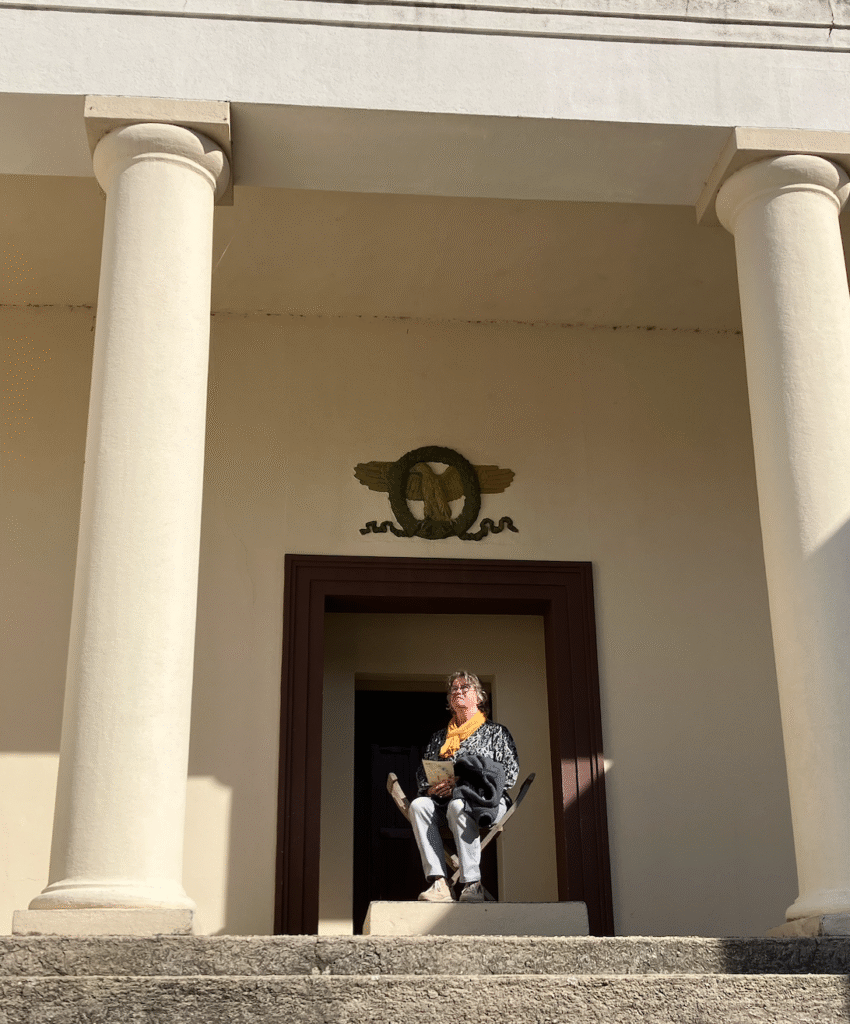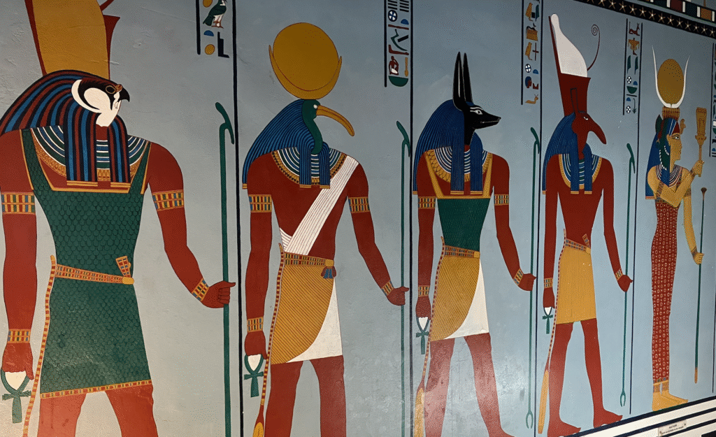 Na een overheerlijke tosti met een drankje gaan we weer verder en komen lang het paviljoen van Egypte met prachtige fresco’s (de voorloper van stripfiguren?).