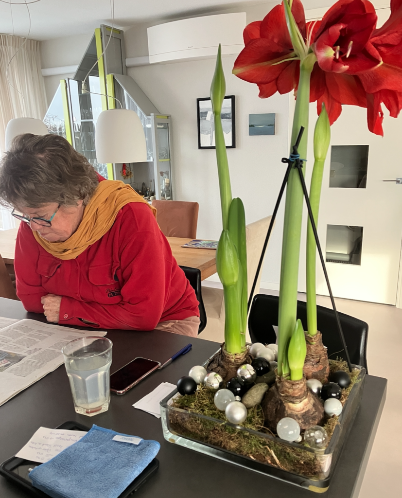 De overeenkomsten tussen Berna en deze Amaryllissen? De kleur rood en de ondersteuning van de bloem.