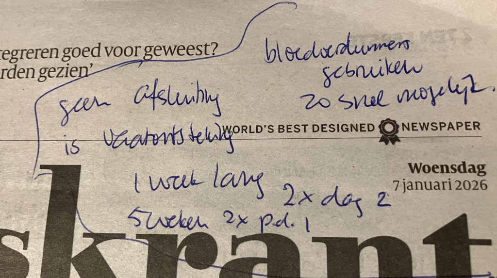 Toen Ap naar huis ploeterde belde de huisarts met Berna: Er werd geen afsluiting gezien maar wel een ontsteking. De huisarts schreef een trombosemiddel voor (Eliquis). Berna schreef het effe snel op een krant en belde Ap. Die ploeterde direct door naar de apotheek. Toen hij door een kuil reed begon zijn iWatch te blèren. Of hij was gevallen. Leg dat maar eens uit met druppels op je bril en ijskoude handen. En die piepkleine knopjes. Soms moet je draaien, soms indrukken. De valwaarschuwing werkt dus wel.